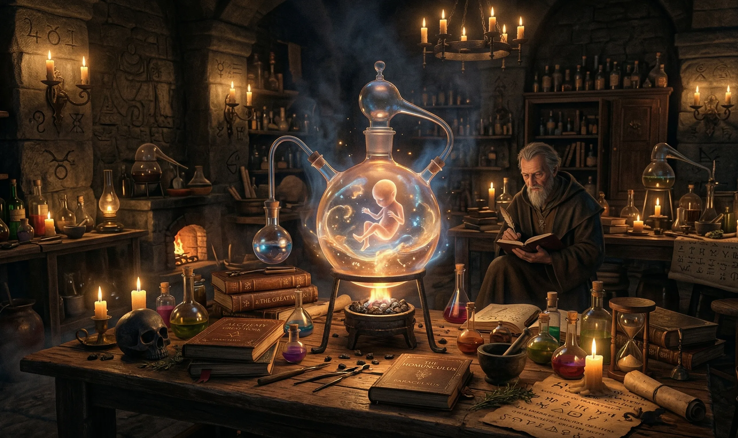 The obsession is ancient. In the 16th century, the Swiss alchemist Paracelsus described a recipe for creating a homunculus, a miniature artificial human. His instructions were disturbingly specific. Place human material in a sealed glass vessel. Keep it at a steady warmth for forty days. Feed it with human blood. According to Paracelsus, the result would be a small living being, transparent at first, eventually growing into a tiny but functional person.